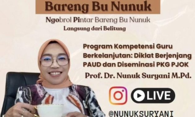 Dalam sesi live Instagram, Dirjen GTK Prof. Nunuk menyampaikan bahwa piloting program PPG Daljab akan segera dimulai minggu depan atau pada hari Selasa depan. Pada tayangan Live Instagram Ngobrol Pintar tersebut, Ibu Nunuk Suryani membahas mengenai program kompetensi guru berkelanjutan, diklat berjenjang PAUD, dan diseminasi PKG PJOK.