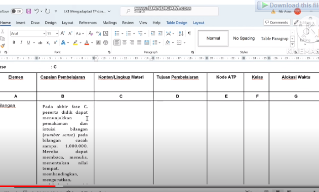 - Menyalin tujuan pembelajaran dari dokumen CP terbaru ke dalam tabel TP dan ATP.
