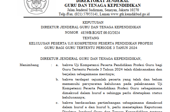 ukdogsite.com – Direktorat Jenderal Guru dan Tenaga Kependidikan (Ditjen GTK) Kemendikbudristek telah secara resmi mengeluarkan Surat Keputusan (SK) terkait hasil kelulusan peserta Uji Kompetensi Pendidikan Profesi Guru (UKPPPG) untuk guru tertentu yang mengikuti ujian pada Periode 3 Tahun 2024. Surat Keputusan ini dikeluarkan dengan Nomor 4859/B.B2/GT.00.02/2024, yang memuat keputusan penting mengenai status kelulusan para peserta.
